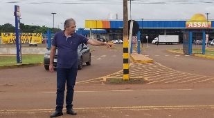 Vereador Romualdo Ramim constata a precariedade da sinalização na entrada do Assaí Atacadista, na Rua Coronel Ponciano (Foto: Gleiber Nascimento)
