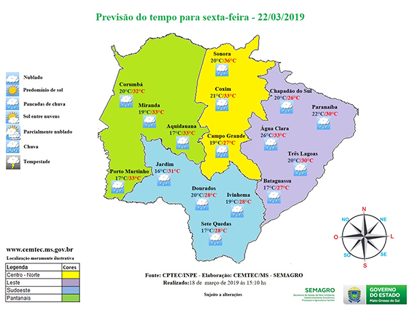 A sexta-feira (22.03) promete ser o dia mais frio da semana. A previsão é de céu nublado com pancadas de chuvas abrangendo todas as áreas de Mato Grosso do Sul, juntamente com temperaturas amenas. A umidade relativa do ar no estado poderá variar entre 50 % a 95 % e a variação das temperaturas está estimada entre 14 °C e 31 °C.