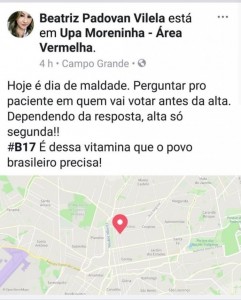 A médica Beatriz Padovan Vilela, que publicou um post no facebook no dia 27 de outubro, véspera do segundo turno das eleições, em uma Unidade Básica de Saúde (UPA) dizendo que apenas pacientes que votassem em Bolsonaro teriam alta, responde a 2 sindicâncias pelo caso.