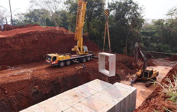 Mais de 100 aduelas serão implantadas para a passagem de águas pluviais. Esta etapa das obras seguirá até a próxima semana e, para apoio destes serviços, a equipe conta com escavadeira, pá-carregadeira, guincho, guindaste de alta capacidade e caminhão munck.