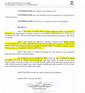 Após decretar que os moradores de Ladário façam orações e jejum contra a covid-19, o prefeito da cidade sul-mato-grossense, Iranil de Lima Soares explica: “Nós resolvemos estimular a fé das pessoas, para que elas possam ter esperança, para que o momento de pânico não invada o coração, a mente delas. Para que elas possam se voltar um pouco para Deus e assim trazer essa esperança que esse momento irá passar e que logo tudo estará restabelecido”.