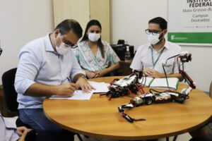 O prefeito Alan Guedes assinou dois convênios com o IFMS (Instituto Federal de Mato Grosso do Sul – Campus Dourados), um para a realização da capacitação e suporte técnico dos professores na implementação do projeto robótica para as escolas da Reme (Rede Municipal de Ensino) e um segundo para a qualificação profissional de jovens e adultos nas áreas de vendedor e operador de computador.